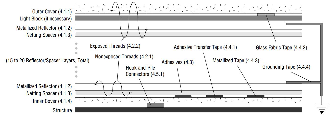 Multilayer insulation (MLI) blankets can be found surrounding nearly every spacecraft, and provide the thermos bottle effect. The complex layering system, shown in Figure 7, prevents both excessive heating and heat loss. The blankets are designed to retain the thermal radiation emitted inside the spacecraft bus, mainly waste heat from electronics, to sustain an operating temperature between 10 and 30 °C. Because MLI absorbs radio waves, it is not placed on the antenna dish. These blankets also protect the spacecraft’s bus from micrometeorites.