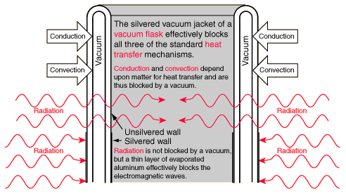 If you make coffee before driving to work, you certainly want the coffee to remain hot upon arrival. To do so you use a thermos bottle, also known as a vacuum flask. These containers are able to retain heat using the physics referenced in Figure 2. The approach taken by New Horizons is to retain heat like a thermos bottle—the spacecraft is already in the vacuum of space where no conductive and convective heat transfer will take place, leaving only radiation transfer. By wrapping the entire spacecraft in a multilayer insulation, radiation dissipation is retarded.
